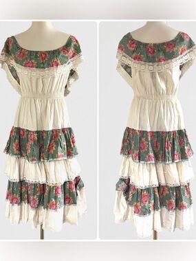 Vintage Young Edwardian by Arpeja Ivory Floral Lace Detail Ruffled Maxi Dress M
