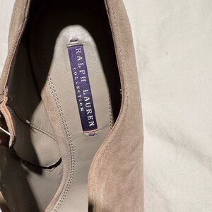 Taupe suede bootie by Ralph Lauren Collection. Size 8B. Wedge height is 4.25”. Never been worn.