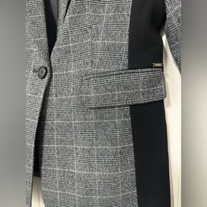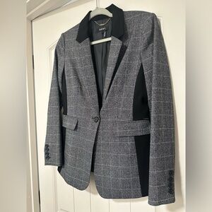 Elegant DKNY blazer with a checkered pattern. Features black accents and a sleek design.