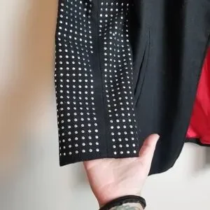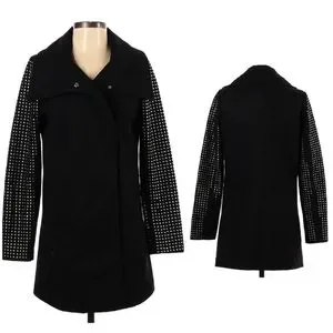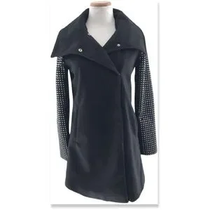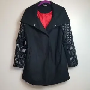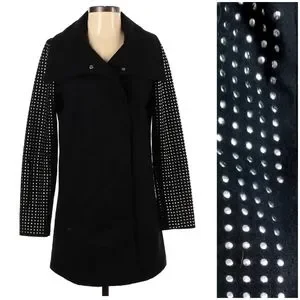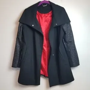 Classic with an edge! Black pea coat with silver studded sleeve detail, front hand pockets and red lining. 90% polyester & 10% wool.