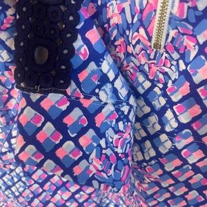 This is a Lilly Pulitzer Skipper Popover sweatshirt in size Small with a royal blue color featuring a pop-up toe-in pattern and crochet accents. It has a full zip closure, long sleeves, a mock neck, and pockets. Made of spandex and cotton knit fabric, this pullover style sweatshirt is perfect for travel, activewear, or casual wear with a resort theme.