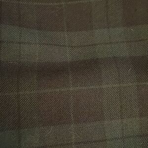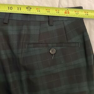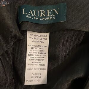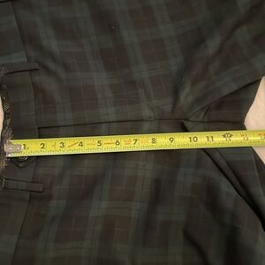 Green tartan plaid, 65% polyester, 35% rayon, trouser, pants be Lauren Ralph Lauren in a women's size 36x30 but have been hemmed to a 36x24. Front button, hook, eye and zipper closure. Side and rear pockets. Machine washable. Approximate measurements shown in photos. In good, pre-owned condition.