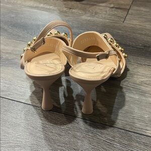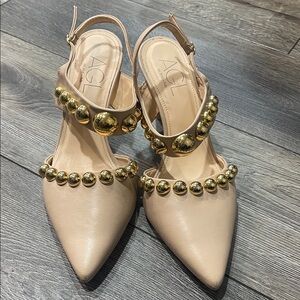 Elegant AGL heels with a beige base and gold studs. Perfect for a sophisticated look.