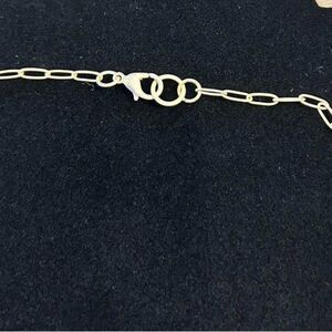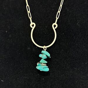 Stylish gold necklace with turquoise pendant. This necklace has an adjustable chain so you can decide how long or short you want to wear it. Would be cute alone or layered with another necklace. This necklace is in excellent used condition.
