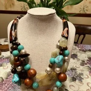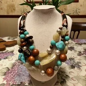 CHICOS ONE OF A KIND NECKLACE WITH AUTHENTIC TURQUOISE, ACRYLIC, WOOD and STONE