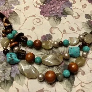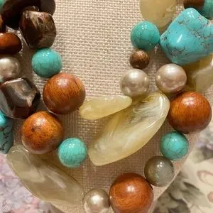Chicos (24” with a 12” drop) beaded necklace. Wood, stones, turquoise, faux pearls and large pieces of golden quartz. It’s a beauty and the authentic stones are stunning.
