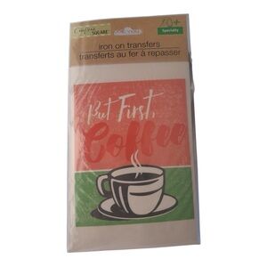 Iron-on transfer with 'But First, Coffee' design. Features a coffee cup graphic. Perfect for customizing apparel.