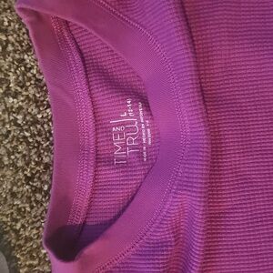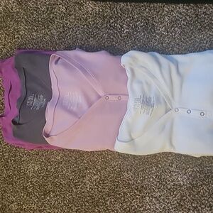 Set of four long sleeve Henley tops in pink, white, gray, and purple. Perfect for casual wear.