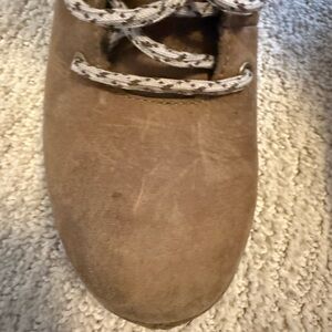 These boots have been loved and used. They since markings around the boots which are in the photos. These Merrill Women's Tan Lace Up Wedge Winter/Hiking Ankle Booties in size 8.5 are perfect for outdoor winter activities. With a round toe shape and lace-up closure, these boots offer both style and functionality. The beige color and outdoor theme make them versatile for casual occasions, while the wedge heel provides added comfort and stability on snowy or icy terrain. Made by Merrell, a trusted brand in outdoor footwear, these booties are a practical and stylish choice for the winter season.