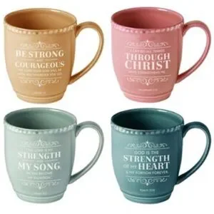 Brighten your day with this set of inspirational ceramic mugs. Featuring uplifting messages, these mugs come in 4 beautiful colors with the following scripture message. Perfect for enjoying your favorite hot beverage.