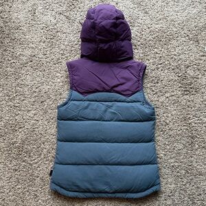 Patagonia Women’s Two-Tone (charcoal grey/dark purple) Hooded Vest, Sz. XS. Immaculate condition. This vest is very thick, meant for outer wear over other items. Zipper + Snap button front closure, two outside lined pockets, inside zipper pocket, puffer hood. Vintage style, deep purple lining.