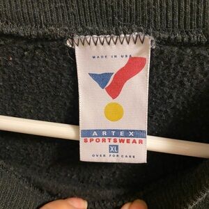 Up for auction is a vintage adult size extra large sweatshirt from the Walt Disney Company on an ARTEX sportswear sweatshirt. It is black with a graphic of Mickey Mouse scared of his own shadow. There are cracks in the graphic. The sweatshirt measures 26 inches across the front of the chest, armpit to armpit, and 27 inches from the top of the shoulder to the bottom of the shirt. It has been worn and washed, but still has a lot of life left. Cute!