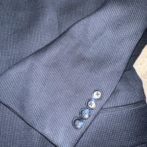 Sophisticated blue textured suit with a sleek design. Ideal for formal events. Features subtle red accents inside. Worn 1x in great condition