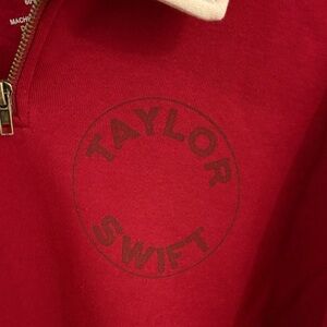 Red quarter-zip sweatshirt with Taylor Swift logo. Beige collar adds contrast.