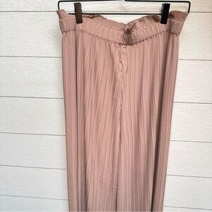 Flowy dusty pink wide-leg pants with a soft pleated texture and elastic waistband.