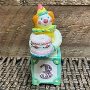 Charming clown holding a pink cake looks like a clown in the box 😂 Stands on a block with numbers 1, 2, 3 and 4 (2 pieces - clown attaches to block). Reusable for first 4 birthdays!
