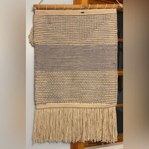 Enhance your home with this elegant handwoven wall hanging. Featuring a soothing cream and gray color palette, it adds a touch of warmth and texture to any room. Perfect for creating a cozy atmosphere.