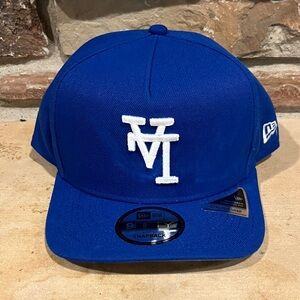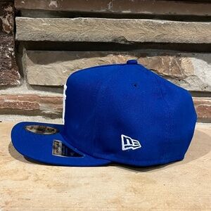 Bold classic royal blue Los Angeles Dodgers snapback by New Era with white embroidered upside-down logo. Ideal for a sporty look. 100% polyester fabric. New with tags. Most items ship next business day.