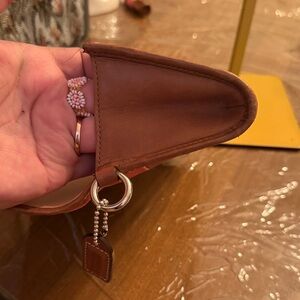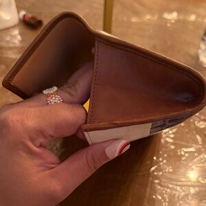 Vibrant Coach wallet with patchwork design. Features blue, brown, cream, and red tones. Unique and stylish accessory.