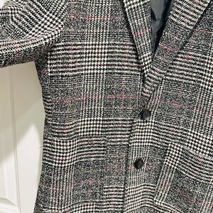 Elevate your style with this chic black and white houndstooth coat. Staying in style and trendy you certainly want to have this coat. It really stands out with a chic classy vibe. Perfect for any occasion, this jacket offers a timeless look with a modern twist. Measures: sleeves 25 1/2”, Lapel 3” wide,