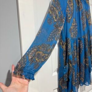 Chic long sleeve dress with paisley design. Vibrant blue fabric. Perfect for stylish outings.