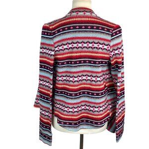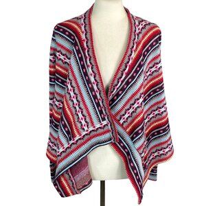 Colorful, thick knit, boho open front cardigan with a flowy draped waterfall front.
