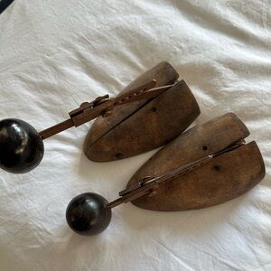 Classic wooden shoe trees with a rich brown finish. I used these for decor. One pair is trademarked Miller. Perfect for maintaining shoe shape. Nice aged patina.