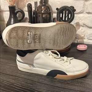Stylish white sneakers with black, fun and silver accents. Comfortable and trendy design. Perfect for casual wear.