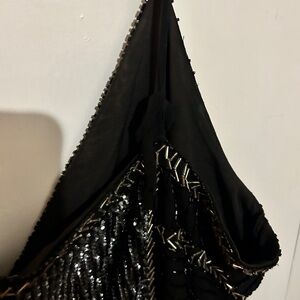 This stunning black and silver dress is perfect for any special occasion. Its elegant design and shimmering details make it a standout piece in any wardrobe. Straps popped and are tied back in place by hand, would be easy fix. Greatly reduced price! Worn once