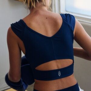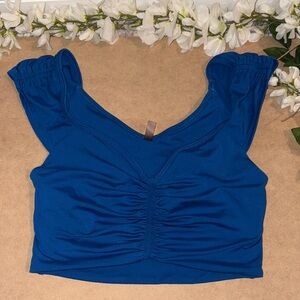 Stylish blue crop top. Features ruched front. Cap sleeves add charm.