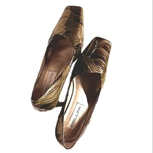 Classic vintage pump heels 9B narrow Woodsy Swamp Embossed Military green camo pattern Square toe Sturdy 3" Block Heels Snake Skin Print Patent leather glossy finish Gently worn Sophisticated