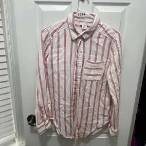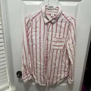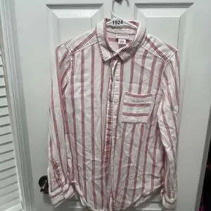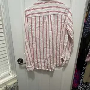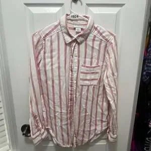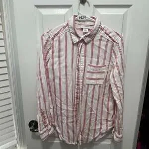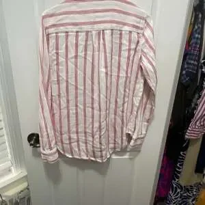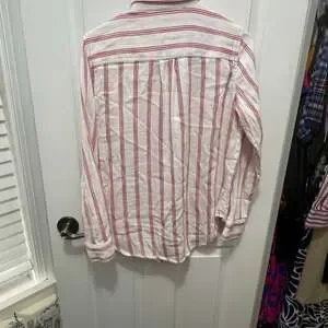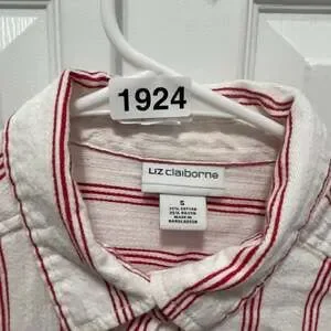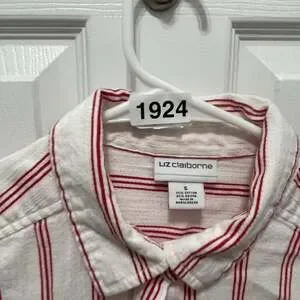 Liz Claiborne red and white striped long-sleeve button-up blouse, women's size Small. Made from a comfortable blend of 75% cotton and 25% rayon, this top is perfect for a casual yet chic look. Features a classic collar and a front chest pocket. Excellent pre-owned condition, with no visible stains or holes.