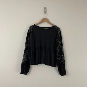 Free People Penny Black Embroidered Sleeve Peplum Top