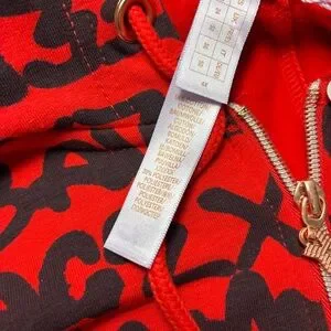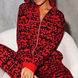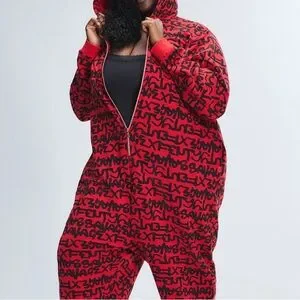 Bold red and black jumpsuit with graphic design. Features a cozy hood and relaxed fit. Ideal for casual wear.