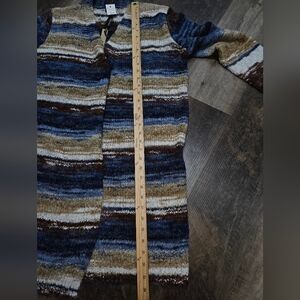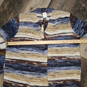 COCO + CARMEN Striped Knit Long Cardigan, Size S/M, NWT. Cozy knit cardigan with blue, brown, and cream stripes. Perfect for layering. The video shows the colors the best. Excellent condition, no holes or stains. Measurements are included in the pictures.