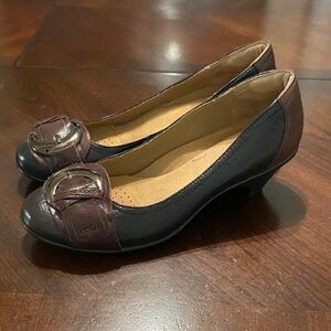 Elegant Softspots heels with a bold buckle. Two-tone black and brown design. Perfect for any occasion.