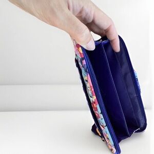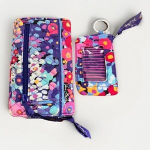 Brighten up your accessories with this colorful Vera Bradley quilted wallet and matching zip ID case set. Both pieces feature Vera’s signature quilted cotton fabric in a bold floral print with purple, pink, yellow, and blue accents.