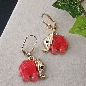 Gold Filled Necklace and Earrings Set Faux Red Jade Elephant