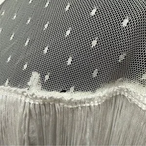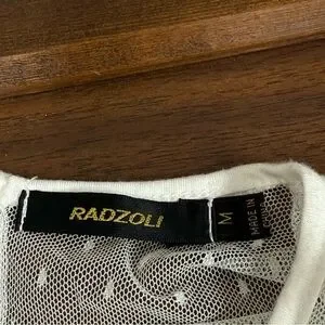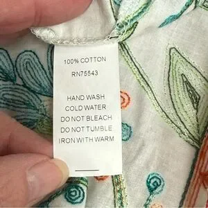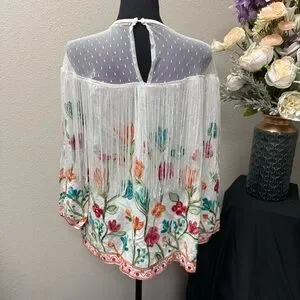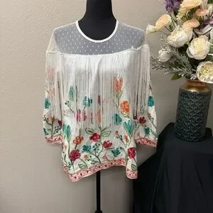 Radzoli Floral Embroidered Fringe Tunic Top Mesh Yoke Boho Chic White M