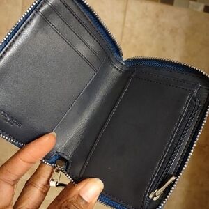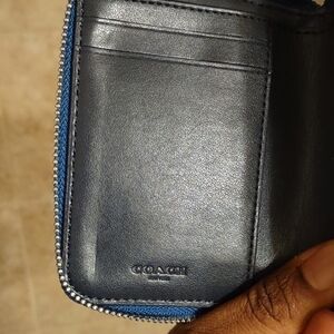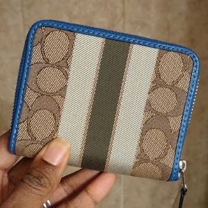 Compact Coach wallet with blue trim. Features signature pattern and logo.