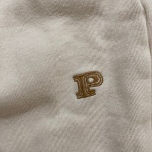 Soft fleece-lined interior, stretchy waistband with drawstring, and a flattering flare leg with small side slit. Cream/ivory color with embroidered P logo. Perfect for lounging, errands, or comfy casual outfits.
