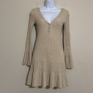 This elegant beige knit dress features a flattering V-neck and stylish bell sleeves. Perfect for any occasion, it offers both comfort and style.