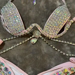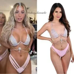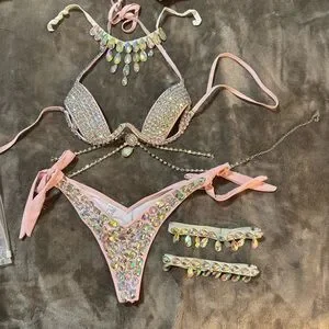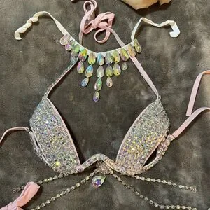 Worn once to a festival. Top as seen on alix earle in photos. Good condition, only flaw is the jewelry connecting to middle piece of bra came off.. can be fixed if you’re good with jewelry. Includes choker and leg garters. Garters have slight discolor on inside, just from wear.