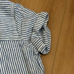 Chic button-down with blue and white stripes. Features short sleeves and front pockets. Ideal for casual outings.