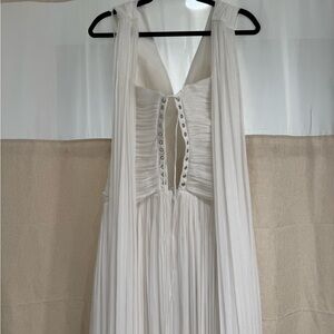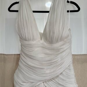 This white halter backless dress is a stunning choice for any bridal and non bridal events. Its graceful design and timeless style make it a wardrobe essential includes Halterneck, Self-tie straps, Sleeveless, Fitted waistline, Boned bodice, Gathered detailing, Pleated skirt, Train design, Rear lace-up fastening, Rear zip fastening, Maxi length, Composition: 88% Terylene fiber, 10% Viscose, 2% Spandex