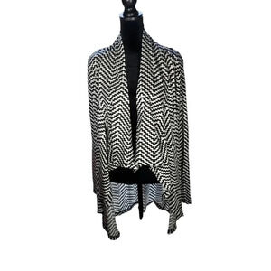 The Limited Chevron Convertible Cardigan Wrap/ Black & Ivory. Size: XL. 97% Acrylic, 3% Spandex. Cowl Neckline, Button on top of shoulder for closing. Machine Washable. Imported. Zoom in to see Pictures for measurements. Long Sleeves. Can be opened or wrapped. Pre- Owned in great condition!