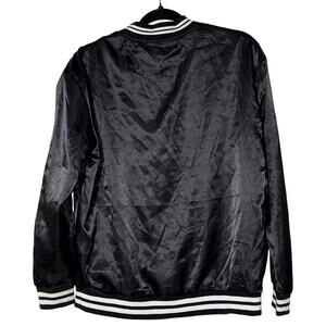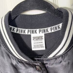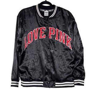 PINK Victoria's Secret 'Love Pink' Black Satin Bomber Button Up Jacket Sz Small