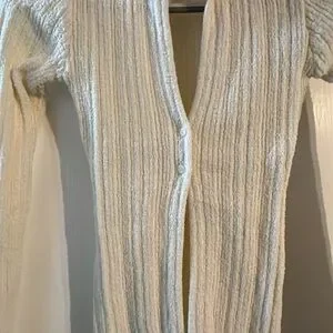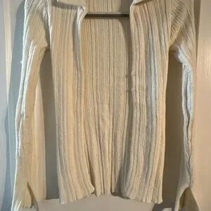 Style: Soft ribbed knit, stretchy, long sleeve, collared, button-front.
