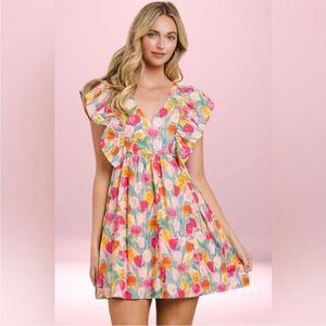 Vibrant floral v neck lined mini dress with flutter sleeves. Made of 100% cotton. Has a back concealed zipper. Perfect for a summer event:)