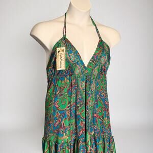 This new with tags bohemian halter maxi dress features a vibrant green, aqua and fuchsia paisley print with subtle candy-cane style swirls.